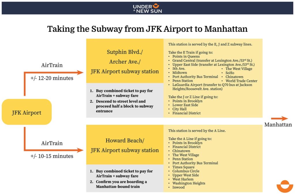 | Subway (AirTrain + A Line) | £7-8 / $8-9 | 59-75 min | Economical, authentic, can be challenging with luggage. |