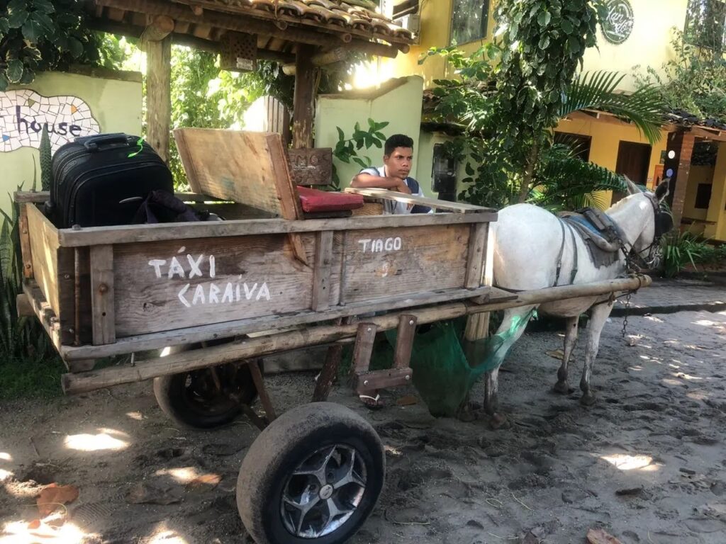 Once you’ve crossed the river, you'll find yourself on Caraíva's soft, sandy paths. Walking to your accommodation is an option, but dragging heavy suitcases through the sand can be tiresome. For this reason, local horse-drawn carriages (charretes) are available. These are solely for luggage transport, not passengers.