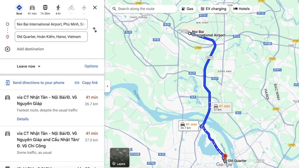 | Taxi | 300,000-400,000 | $12-$16 | 30-40 mins | 24/7 | Mai Linh (green), Taxi Group (white), Noi Bai Taxi (yellow) |