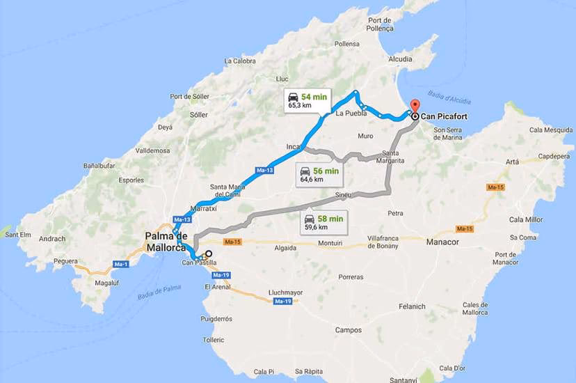 - Enter your pick-up location (Palma de Mallorca Airport - PMI) and your destination (Can Picafort).